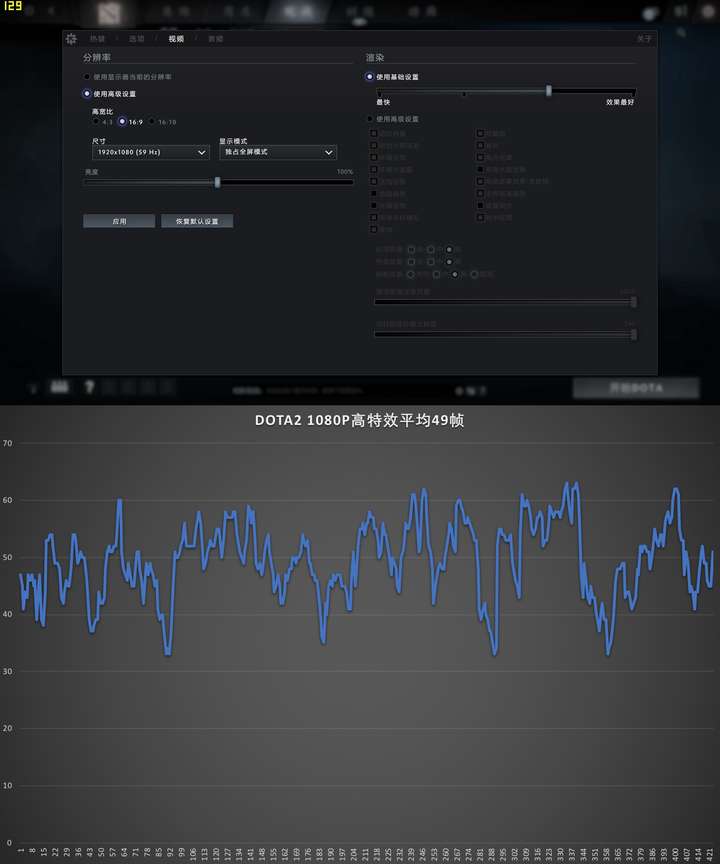 DOTA2:可以一起参考的还有lol,不过lol要求比DOTA2还更低一点,所以能流畅DOTA2的话,就完全可以不用担心lol。虽然moba游戏一般超过30帧就算流畅了,不过个人还是希望可以稳定在60帧以上上。在1080p,中等特效情况下,Ryzen 3 2200G还是可以稳定60+的帧数,而且我试了下高特效,也可以稳定在在49帧数,个人觉得这个结果算不错。