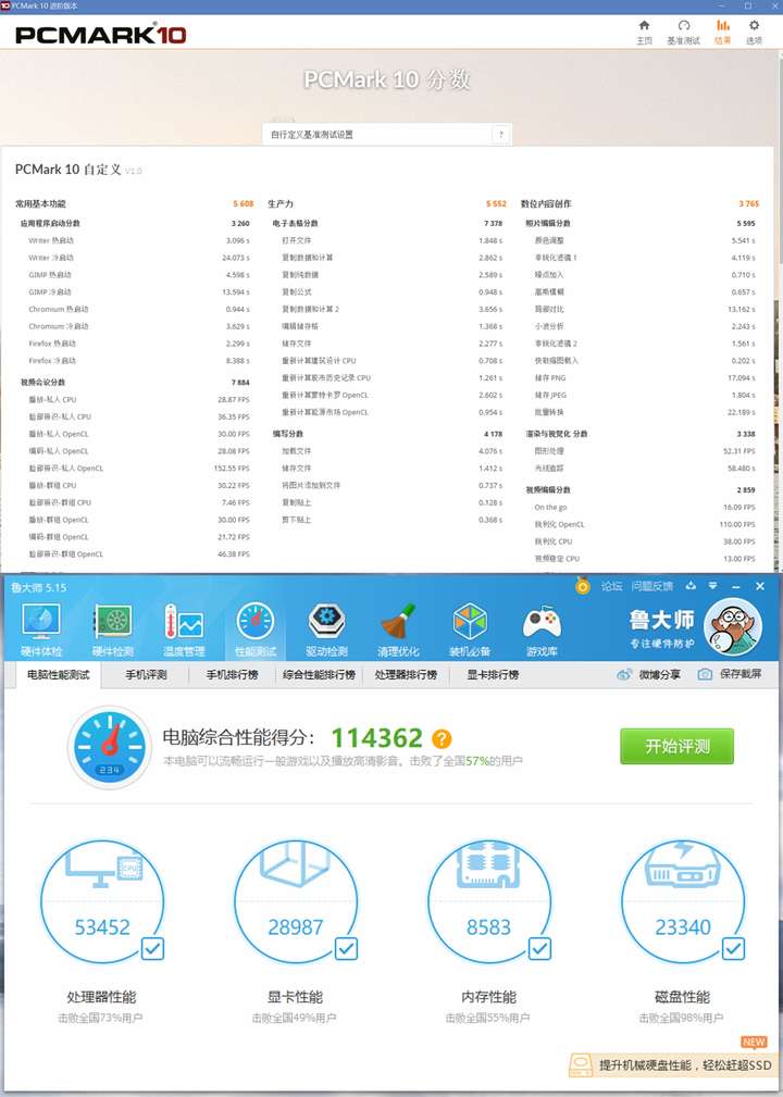 整机理论性能,主要测试了PCMARK跟鲁大师,方便大家对比参考。
