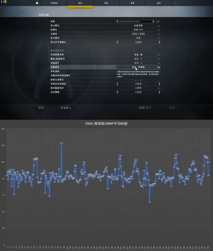 CSGO:CSGO对硬件要求实际不高,只不过我还是比较好奇Ryzen 3 2200G可以跑到多少平均帧。实际测试特效最高,平均帧数是85,而特效设置为高或者中等,平均帧数已经可以破百,用来搭配电竞显示器挺好的。