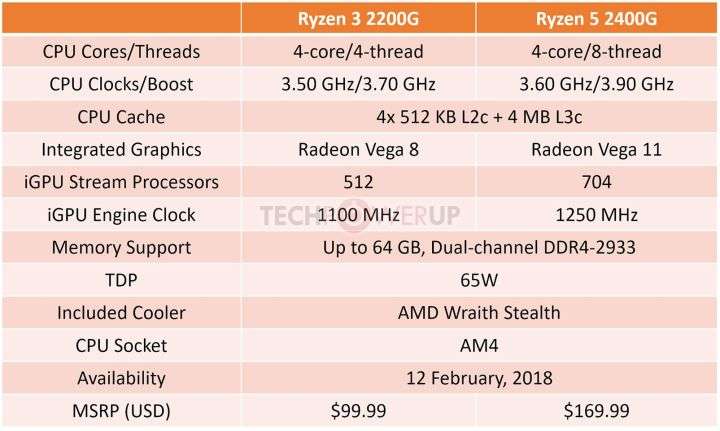 下面来自techpowerup的图片可以看出Ryzen3 2200G跟Ryzen 5 2400G的区别,主要在于NCU单元、SP流处理器、GPU/CPU频率、逻辑核心的不同。价格一个六百多,一个一千二,AMD的定价区别算还蛮精准。