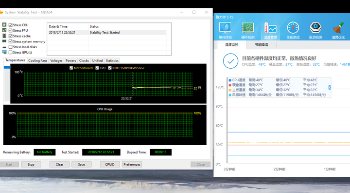 温度测试,这边主要测试Ryzen 3 2200G本身发热情况,另外附带的原装散热器是否可以压制住CPU满载的热量。实际测试来看,哪怕双满载的情况,室内裸机(室温17°)满载温度也就在50°,加上装机后温度大概提升3-5°范围,也还是比较理想的。除非你打算折腾无风扇全被动,要不Ryzen 3 2200G的温度可以不用担心。