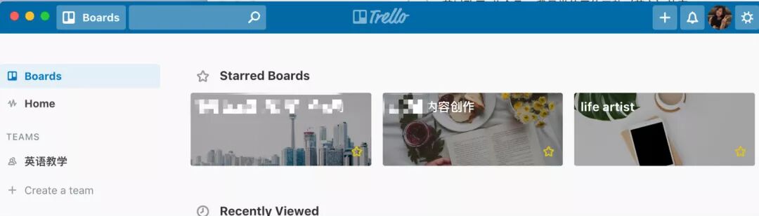 Board ,即看板,在Trello主页点击加号添加,看板用来放你的任务列表。可以设置星标看板(starred board),个人看板(personal board)和团队(team)
