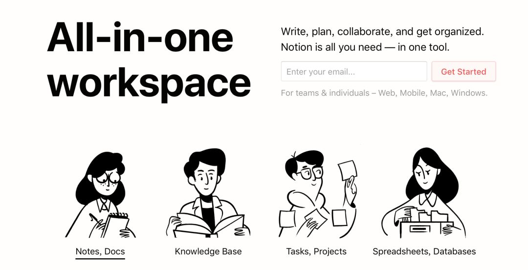 Notion官网对它的定义是 all-in-one workspace ,即一体化的工作区,将以下四项无缝整合的协作工具: