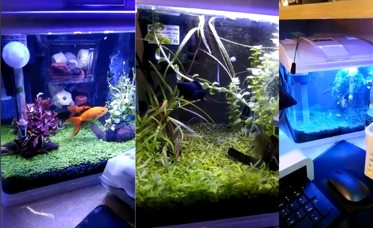 鱼缸里有水草、有造景石;有虾、有螺、有鱼。历史上还曾经有鱼产过卵,然而由于照顾不周...都挂掉了😪。氧气由水草自给自足,鱼缸带有循环装置用于过滤水,两周大概换一次水。