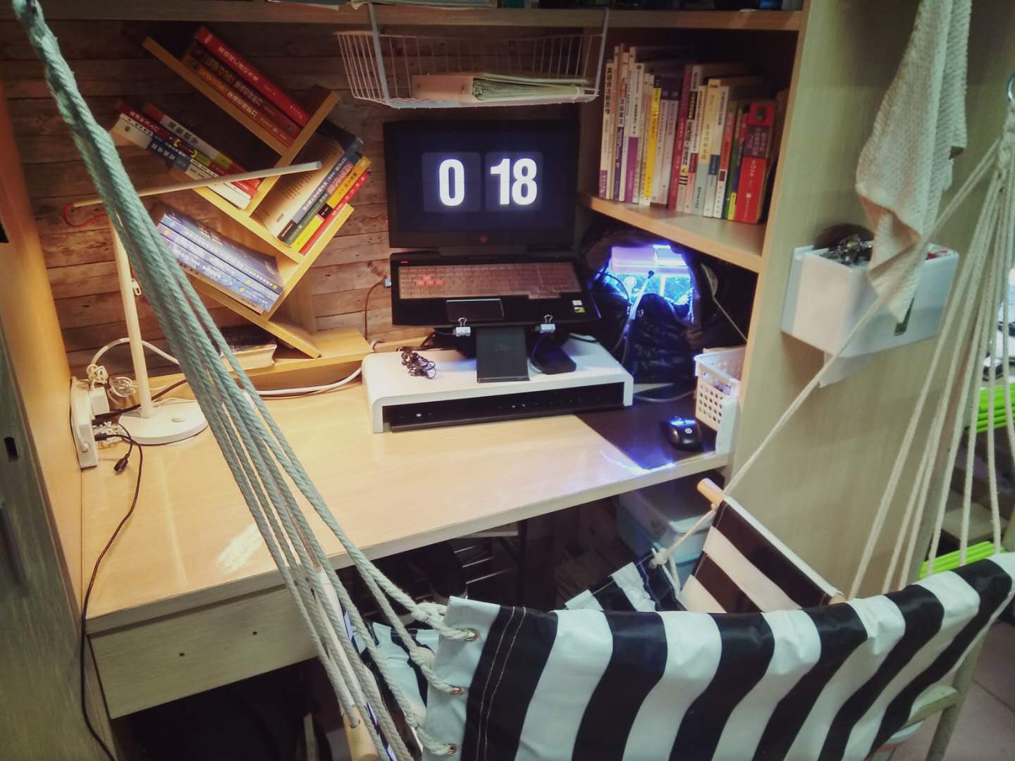 当然,一切都不是一蹴而就的。作为一个学生党,预算有限🙃,布置桌面前前后后花了一年多时间。上图是半学期之前的照片,那个时候还用的吊椅(真的只是看着舒服,然而没办法学习🤷♀️。同时累腰)。后来又添置了小爱同学和智能家居配件,让生活多一些「自动化」。