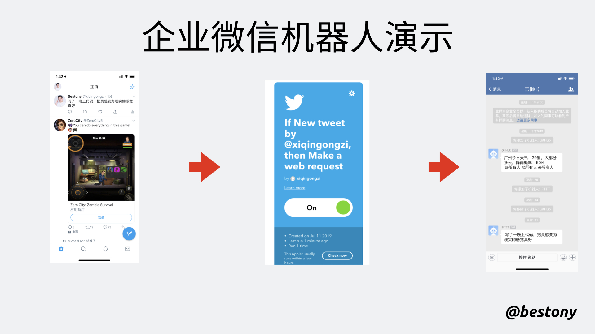 比如说,我这里借助 IFTTT ,实现了我的 Twitter 账号发布一个消息,就会自动将信息转发到我的企业微信群内。