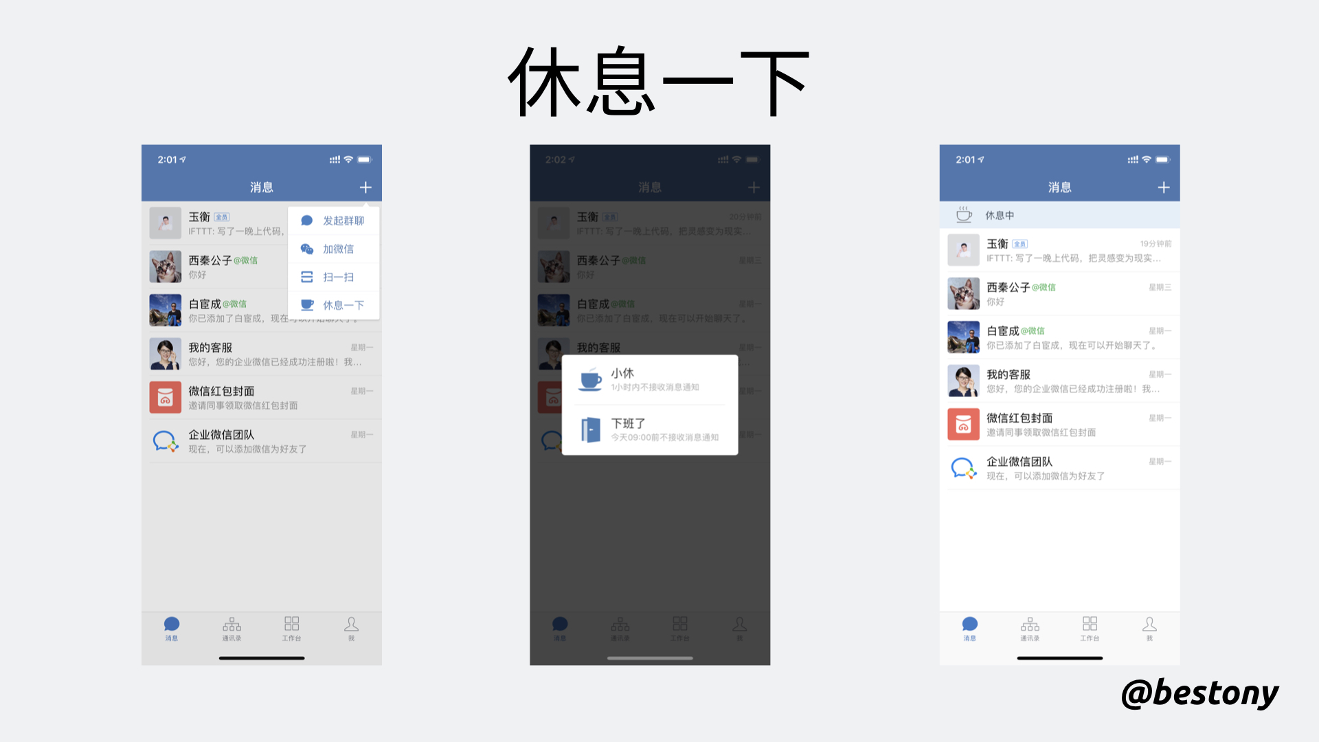 在企业微信中,有一个功能叫“休息一下”,这个功能可以设置我们的企业微信暂时不接受消息,借助于休息一下,我们可以设置企业微信在一个小时,或者是当天的9点之前不接受消息。