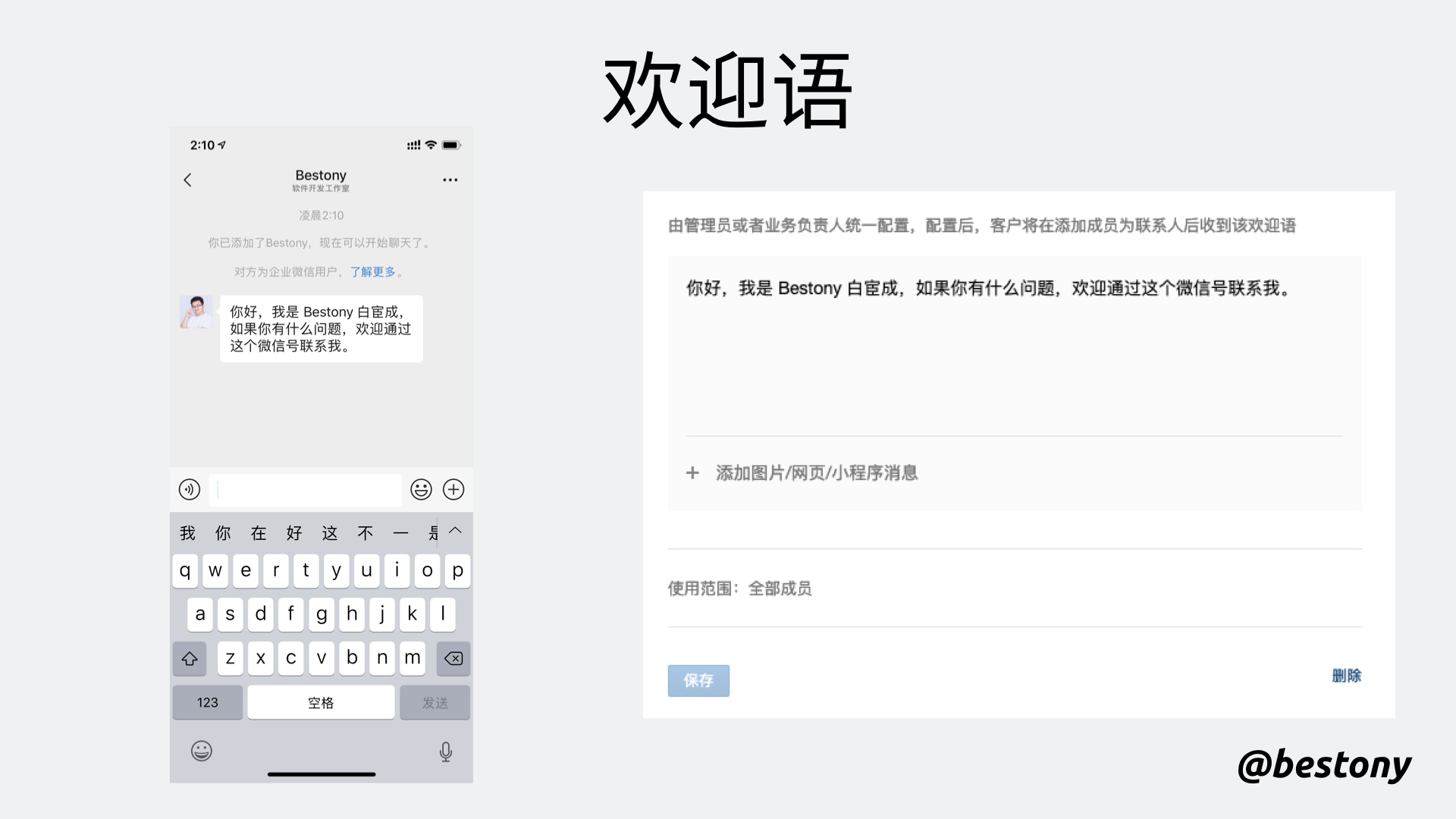 在企业微信的后台中的「客户联系」-「配置」-「欢迎语」中,我们可以设置默认情况下,别人加我们的时候,系统会自动回复一段信息,这样可以简化我们自己的操作。而且,这个自动回复可以加入图片、网页,甚至是小程序的页面,这样的自动回复,比我们自己去用机器人做简单了许多。
