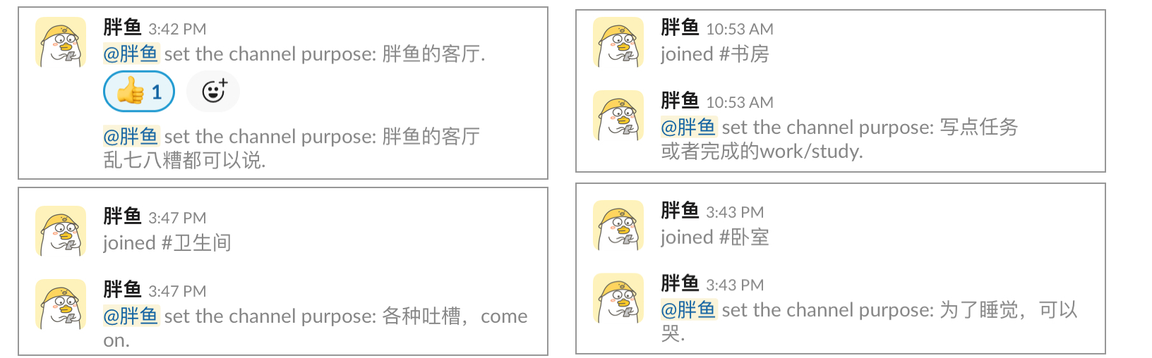 关于另一个记录我内心小世界的工具,就是在 Slack 里建一个自己的 Workplace。然后建各种情绪表达的 channels。