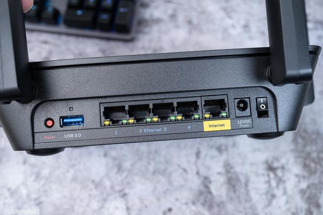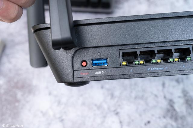 接口上,从左到右依次是重置按钮、USB3.0接口、4个千兆LAN口,一个千兆WAN口,电源接口和实体开关键。
