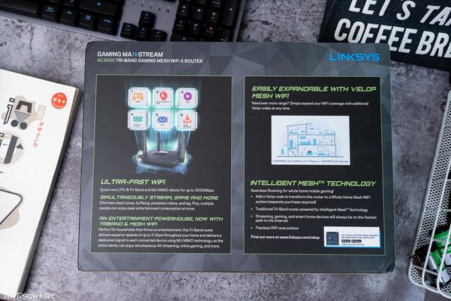 包装上倒是突出了电竞路由器的特点,黑色的底色配上蓝色的装饰图片,上面展示出路由器的外观,右下角的velop图案则标明了这款路由器可以和velop路由器系统一起组成Mesh网络工作。
