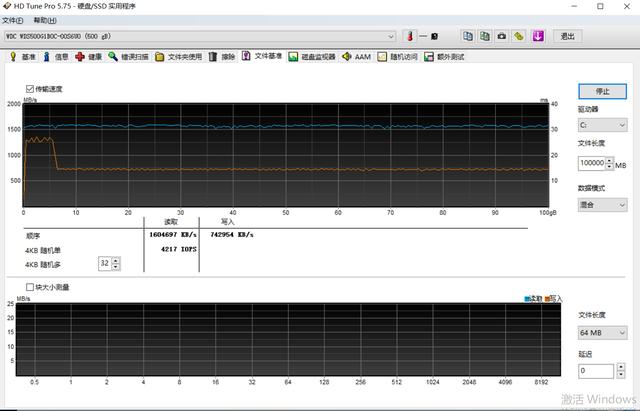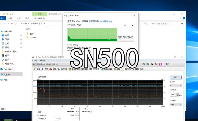 我们通过HD Tune Pro 和一次全盘写入测试下模拟SLC缓存和缓外写入有多少,全盘写入包括一个250G的电影文件夹和一个steam软件和两款游戏的160G的文件夹。