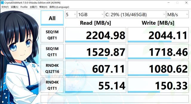 CrystalDiskMark测试 ,测试数据量 1G,空盘和满盘状态下各测一次,这款软件能较好的反应固态硬盘在使用过程中,极限速度能到多少。
