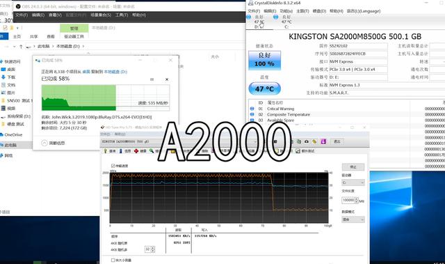 我们今天测试的也是500G版本,他是最后一个上市的,市场定位接近于前两者的硬盘,最大买点竟然是,附赠了一个做工不错的散热片,也还行,他也是今天测试的硬盘里面 标称读写最高的,读取2200、写入2000、但金士顿作为一家知名的,自己不造颗粒的知名的存储厂商,究竟怎么样,还得看实测数据。