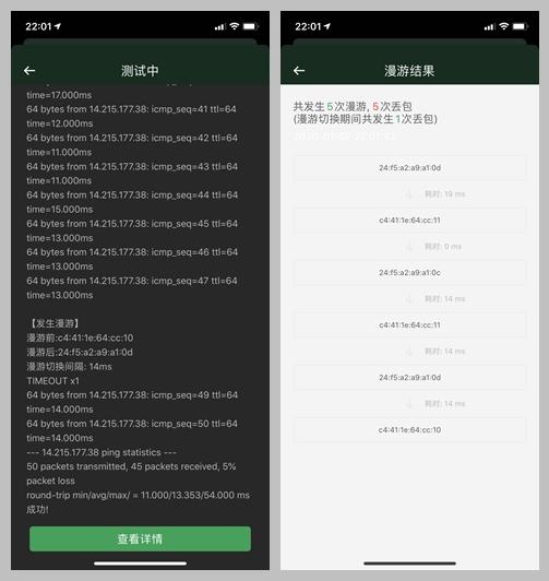 换为支持802.11krv无缝漫游的Iphone11进行测试,可以看到漫游的切换时间只有十几毫秒,丢包也较小。这样的切换时间,在视频通话和游戏时几乎感觉不到切换的发生。