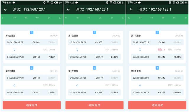 漫游测试上,楼主使用了wifi魔盒进行测试,先使用不支持802.11krv N的安卓手机进行漫游测试,6次漫游中只有一次出现丢包,漫游效果不错。