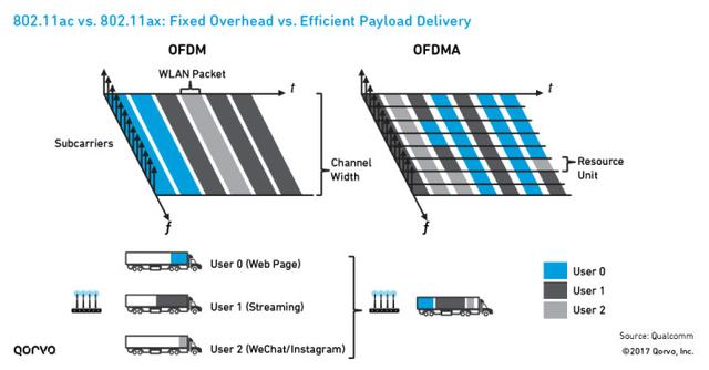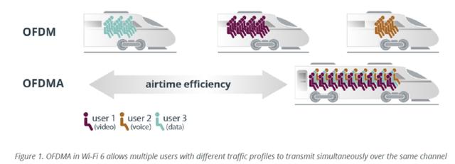 既然是Wi-Fi6路由,和普通AC路由器的差别在哪呢?来简单说说Wi-Fi6背后的802.11ax 技术吧。 1、OFDMA – 提升每人平均速度 OFDMA 绝对是 802.11ax 的重点!简单来说可想像 Wi-Fi 数据传输就像列车载人,人即数据。在 ac 旧制式的 OFDM 下,要运载 3 个队伍的人,就要分别使用 3 辆列车来载绿队、紫队和金队,而且也要等金队列车走了,紫队才可坐下一班列车起行传输,这样中间会有延迟)。比如有 3 个用户要传输数据,同一时间只有一部装置传输,还要逐个轮候传输,并没有用尽带宽。 而ax新制式的 OFDMA 解决了这个问题,让不同用户的数据都可同时传输。做法就是把一辆列车分成最多 9 行座位( 20MHz 频宽),令不同队伍的人都可坐在同一辆列车,那么金队、紫队和绿队都可有成员登上首班车,尽快先运送部分成员,比 OFDM 更早有成员抵达目的地;而且列车也坐满人,网络资源得到充分利用。 OFDMA 对于多人上网的环境尤为奏效, 让4K 影片、电影、直播等着重低延迟的应用都能顺畅无比~即使面对 2022 年每个家庭有多达 50 台网络设备、有更多设备需要同时传输的 IoT 大时代,AX路由器都能应对。