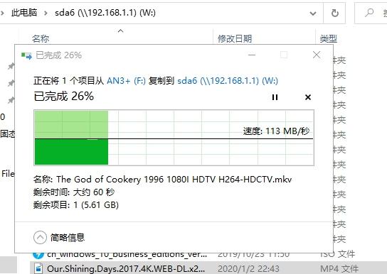 将该硬盘映射到PC上,向其中读写文件,可以看到读写速度都稳定在113MB/s,这个数据已经跑满千兆网络,甚至要略微好过楼主家的NAS,从传输曲线看也是相当平滑,基本没有波动。所以完全可以接入移动硬盘或者U盘充当简易家庭媒体服务中心的角色。