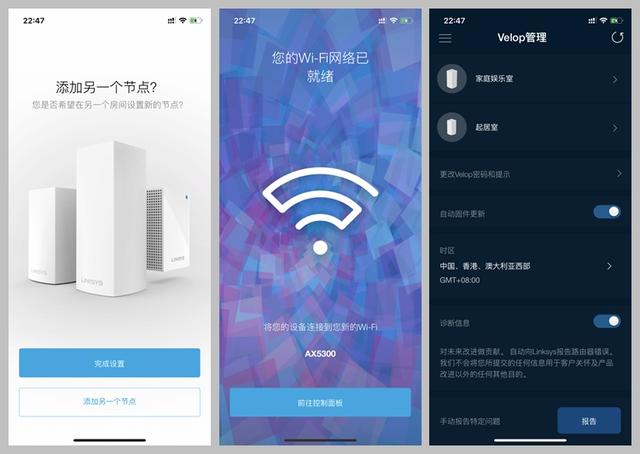 Mesh组网上也是相当方便,得益于Velop的兼容性,其可以轻松的和家中的其它的Velop路由器组成Mesh网络,比如我家中的AC3900就可以和MX5300兼容,只需要在APP中简单设置就可以将AC3900添加进MX5300的Mesh网络中,大大降低了设备更换的成本。
