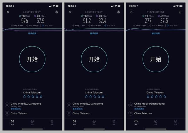 接下来,楼主使用SPEEDTEST进行测试,以下三张截图从左至右分别是客厅、A点、B点,基本上覆盖了家中最常用的位置和边角,整个过程中信号还是很稳定的。 可以看到在一墙之隔的客厅中完全可以跑满500M的带宽,A点因为厨房有金属门阻隔,速度较低一些,但下载仍然有50MB/s,日常使用完全没有问题,B点的下载速度则为277MB/s,这样的速度楼主十分满意。