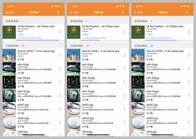 Wi-Fi6相较于上一代AC路由器,最大的不同就是带宽增加, 楼主也通过Iphone11手机连接家中的NAS,进行下载,来看看使用MX5300时网速是否有改变。 如下图,从左至右依次为MX5300,AC路由器的5G连接和2.4G连接,可以看到速度为约70MB/s、50MB/s、11.5MB/s,使用Wi-Fi6时速度有了较大的提升,这意味着手机访问网络的带宽更大,上网及内网传输视频备份照片时速度更快。