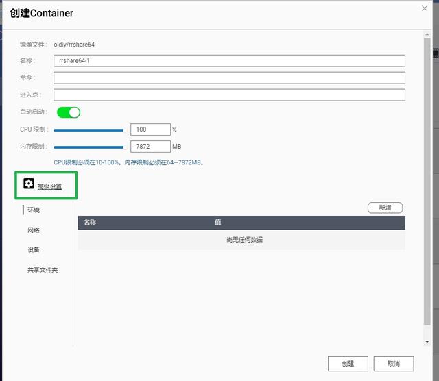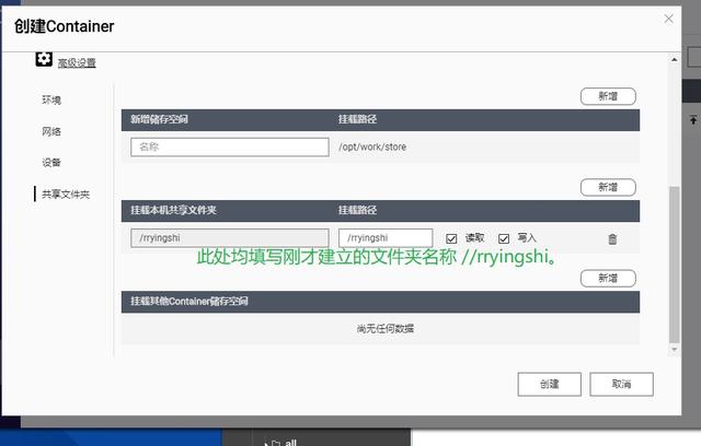 点击高级设置,这里只需要对共享文件夹进行设置,在挂载本机文件夹那一栏点击新增,将//rryingshi这个刚才建议文件夹名字填写进输入框里。上面的环境、网络、设备默认即可,当然,如果有需要,也可以在网络选项中对具体的端口号进行设置。