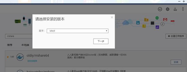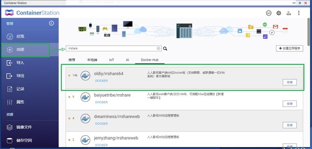 接下来,回到Container Station中,在创建一栏中,搜索rrshare,可以看到好几个镜像,安装第一个就行,点击后面的安装,选择latest安装最近的版本。