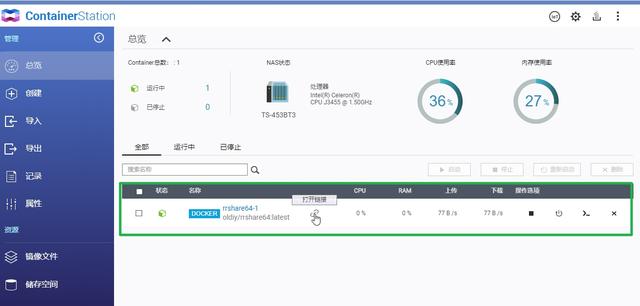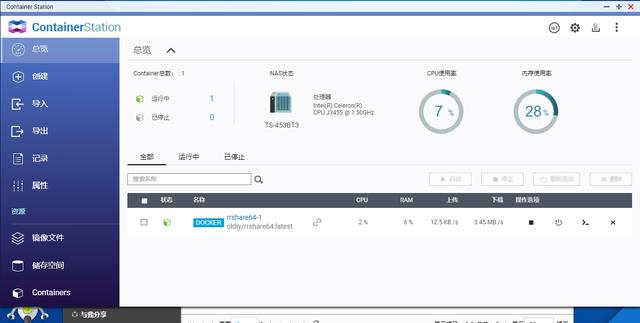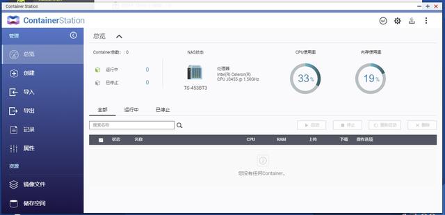 这是安装之后的界面,在左侧的总览中可以看到当前Container Station的状态,包括运行中的Container,系统资源占用情况等。