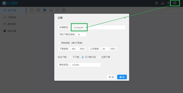 然后就是插件的管理页面了,右上角可以登录自己的人人影视账号、进行系统设置,要把设置中默认的存储路径改为//rryingshi,也可以根据自己的需要对同时下载任务数、下载上传速度、订阅下载进行设置。