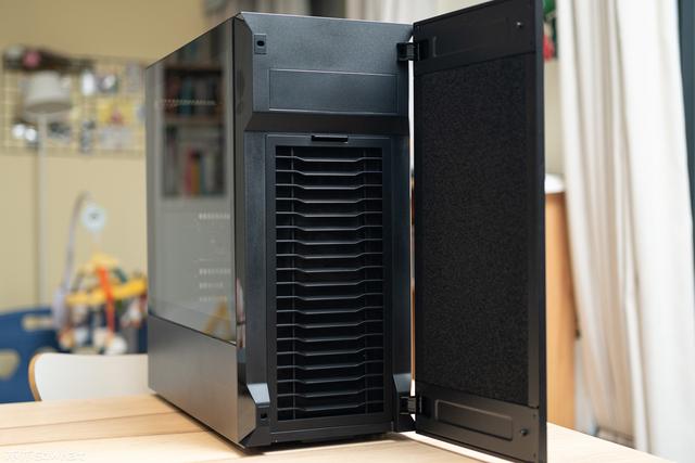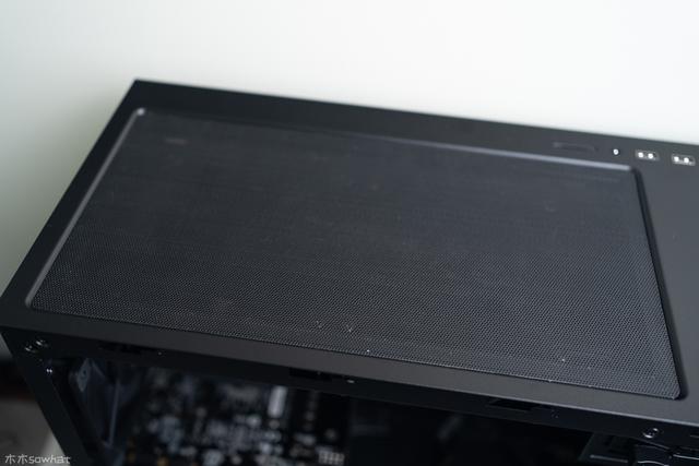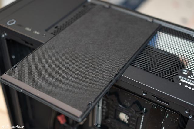 对水冷使用也比较友好,顶部盖板提供了两种形式,一种一种为磁性式防尘网,适合安装水冷或者强化散热时使用,另一种为静音盖板,从顶部可以轻松的将水冷安装好。