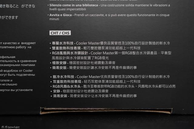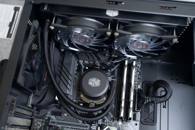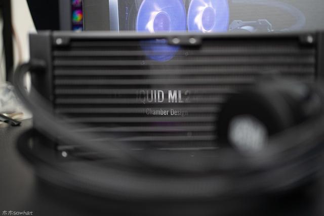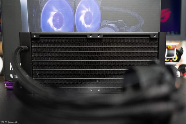冷排侧面有酷冷至尊LOGO,冷排尺寸为282X119.6X27mm,鳍片为铝质材料,间距适中,风扇较容易吹透,水冷排采用创新科技,外观简约时尚,蓄水量比原来的水排提升约20%的蓄水容积,散热效果能得到进一步提升。