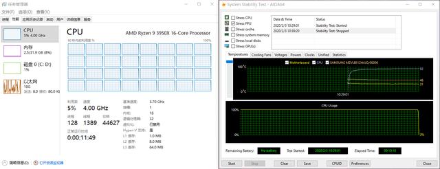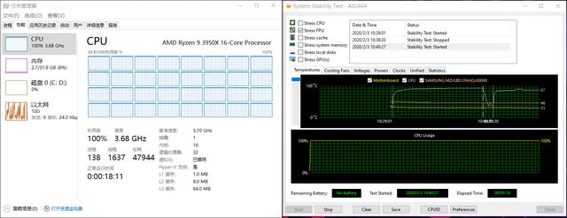 默频下烤机最高温为87度,要知道3950X可是有着16核心的CPU,这样的温度完全可以接受。