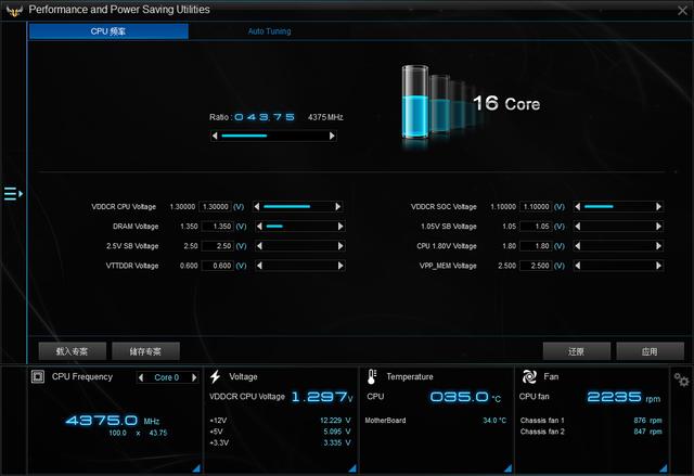 接下来,楼主使用华硕的AI suite3软件配合这款主板进行超频,最后发现日常稳定使用的频率在4.375GHz,得益于水冷的高效压制,CPU温度也保持在比较低的水平,水冷噪音也在很低的水平上,目前也稳定使用了好几天,可以说达到一个较好的平衡。
