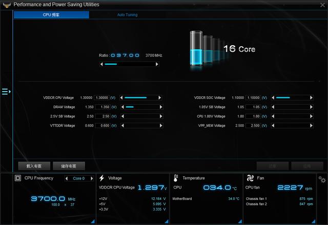 默认频率下CPU温度可以压在34度,此时室温为22度,这个温度可以说相当低了。 使用华硕的AI suite3软件对电压、风扇转速、温度等进行监控和调节,同时也可以进行超频。