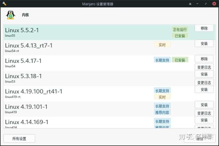 今天装好Manjaro之后不久,任务栏便提示有内核的升级,打开之后,“Manjaro设置管理器”的内核窗口便呈现出来,选择最新的5.5.2,再点击“安装”按钮就行了,极大地简化了更新内核的复杂性,实在是初学者的福音。当然,你也可以打开这个“设置管理器”,里面还有硬件设定、本地化设定、用户帐户等相关设置,简洁高效!