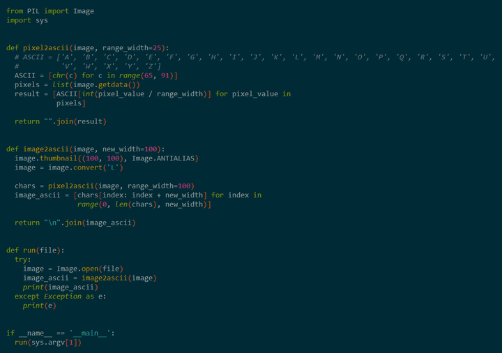 通过chr 生成一个A到Z的数组,因为不到显示需要的255个灰度值,所以需要做个除法计算。根据具体的图片,我们可以通过调整range_width值改善图片的显示质量最后按每行100个字符逐行打印出转换完的字符就好了。