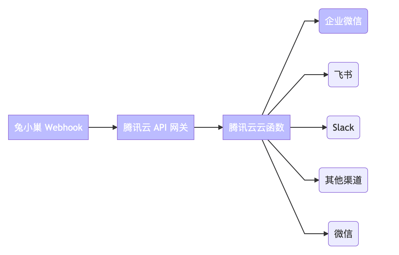 但是,兔小巢本身并不具备实时推送问答的能力,因此,我们需要借助一些第三方工具来完成自己的目的,在这篇文章中,我将向你介绍,如何使用腾讯云云函数将兔小巢的消息转发到企业微信当中。当然,如果你使用的聊天工具不是企业微信,而是诸如飞书、Slack、Bearychat,你也可以参考这里的说明,完成自己的相应的需求的实现。
