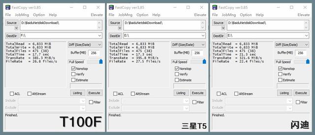 再来看大量小文件拷贝的情况,使用fastcopy从其它盘向三款移动固态硬盘中分别拷入一个6.8G的文件夹,文件夹中包含大量小文件。