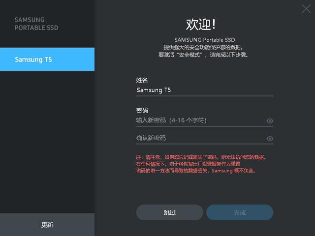 三星附带的SAMSUNG PORTABLE SSD软件是一个加密软件,功能有点太简单了,仅仅是给移动固态硬盘添加密码锁,添加密码后,插入移动固态硬盘时需要输入密码才能使用。自己用倒还好,如果要分享给同事使用就比较麻烦,这点不如海康威视T100F的私有区、公有区区分方便。