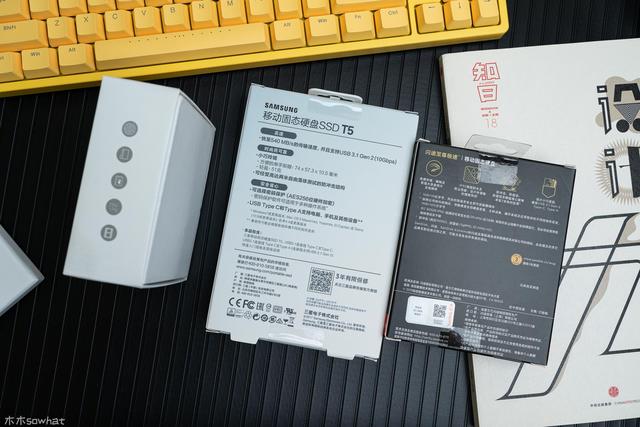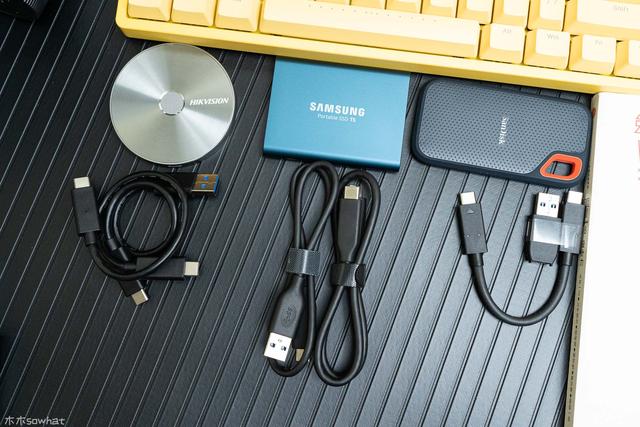 三款移动固态硬盘的配件都有说明书、保修卡和数据线,海康威视T100F和三星T5均配备了Type-A to Type-C和Type-C to Type-C两根数据线,闪迪极速移动版则Type-C to Type-C线和USB-A转USB-C转接头。