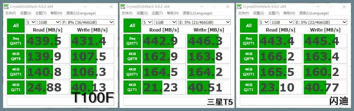 接下来是Crystal Disk Mark测试,三款移动固态硬盘的成绩都差不多,读写都在440MB/s,数据上基本一致。