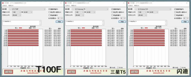 再来看ATTO磁盘基准测试中,从1MB的小文件到64MB的较大文件,三款移动固态硬盘的读写均在440MB/s左右,基本上没什么差距。