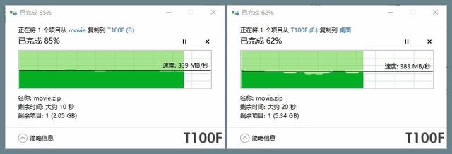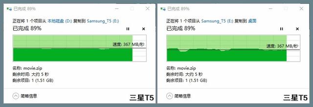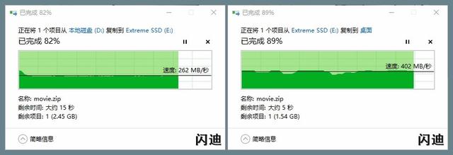 再来看windows的实际读取和写入情况,以下图片左边为向移动固态硬盘写入的读数,右边则是从移动固态硬盘向外拷贝数据的读数。