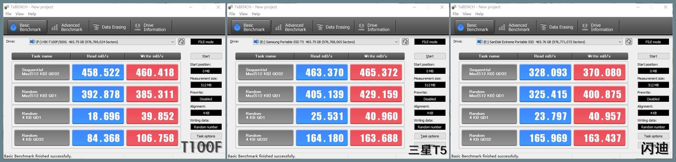 海康威视T100F和三星T5数据差距不大,在写入和读取上互有胜负,闪迪读取速度最高,但写入速度260MB/s,是三款移动固态硬盘中最低的。