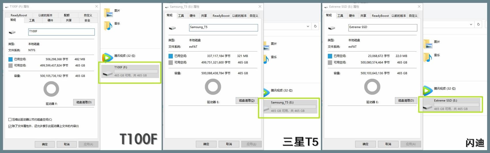 先来看默认容量,三款移动固态硬盘在windows系统中识别出的可用容量均为465G。
