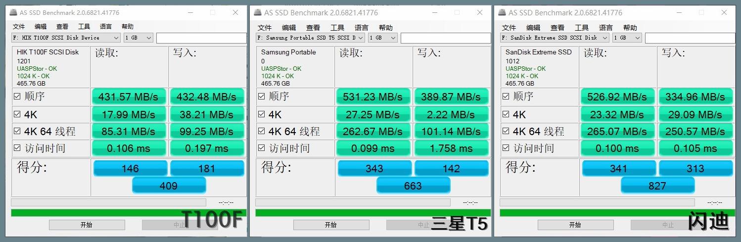 使用比较常见的AS SSD Benchmark进行测试。可以看到海康威视T100F的读写均在430MB/s左右,三星T5和闪迪极速移动版读取速度在530MB/s左右,写入上三星T5为389MB/s,闪迪极速移动版为334MB/s。在写入速度上海康威视T100F占优,读取上三星T5和闪迪极速移动版占优。