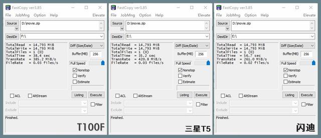 先看大文件拷贝,使用fastcopy从其它固态硬盘向三款移动固态硬盘中分别拷入一个14.7G的大文件,