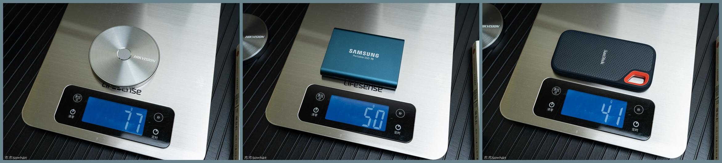 三者重量上,海康威视T100F大概是因为增加了指纹模块,所以最重,为77g,三星T5为50g,闪迪极速移动版则为41g,不过整体上看,三者都属于比较便携的水平。