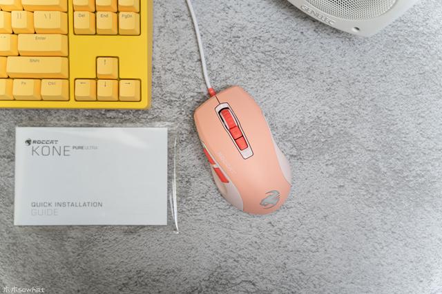 魔幻豹Kone Pure Ultra 夜枭轻量版沿用了该系列一贯的设计语言,为右手鼠标,外形曲线十分流畅,鼠标尾部还显现出冰豹的图案LOGO,带有1680万种背光色彩,整体效果非常炫酷,这款鼠标的外壳采用Pro-Grip表面打造,有点像亲肤涂层,触感细腻,与红色的按键搭配起来多了几分可爱。