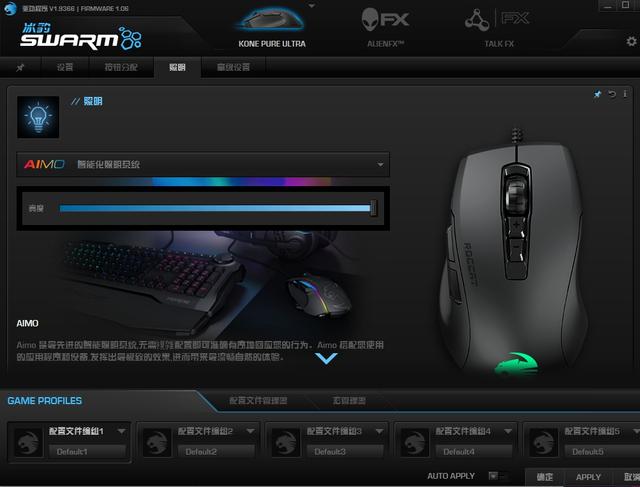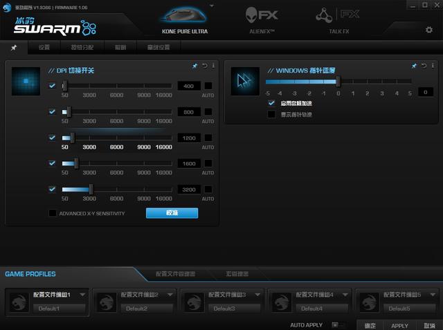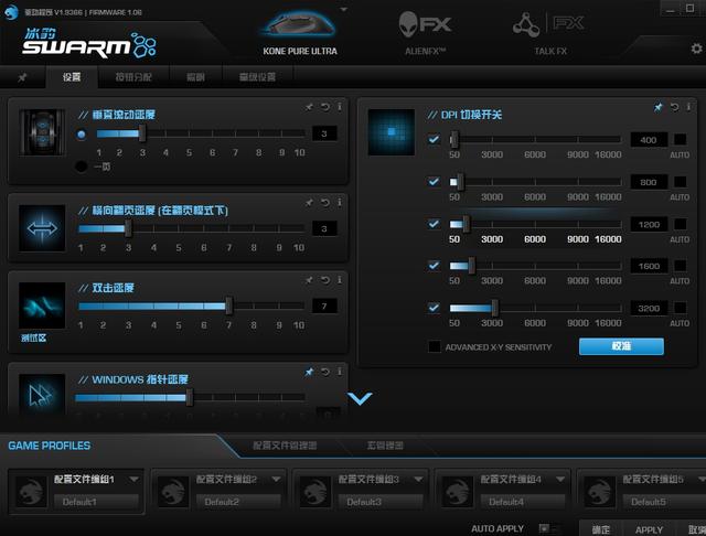 鼠标默认有5档DPI调节,可以在SWARM软件中设置指针速度、双击速度、滚动速度等等。